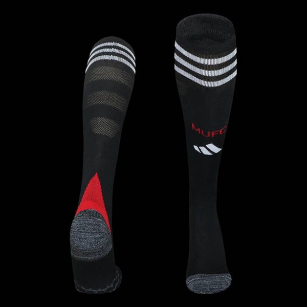 Col et manches avec liserés noirs et blancs, rappelant l'élégance classique d’Old Trafford